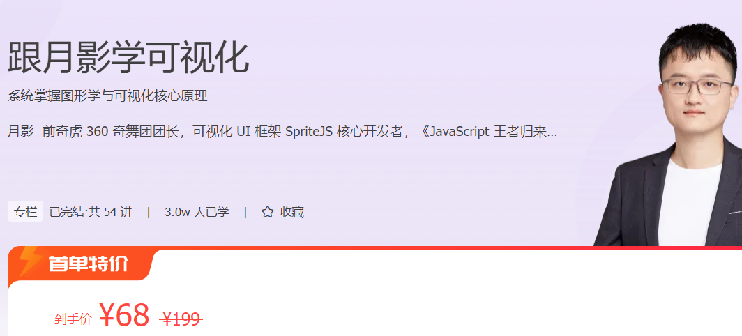 为此,我们特意邀请了月影,来给你系统讲解可视化开发的原理和方法、数据处理的技巧以及视觉呈现的各种方式,帮助你创建出自己的可视化工具集,更高效地解决可视化开发中的问题。由此,你不仅可以实现更具冲击力的视觉效果,还能从中收获高级的前端知识,让你成为“更懂前端”的可视化人才。