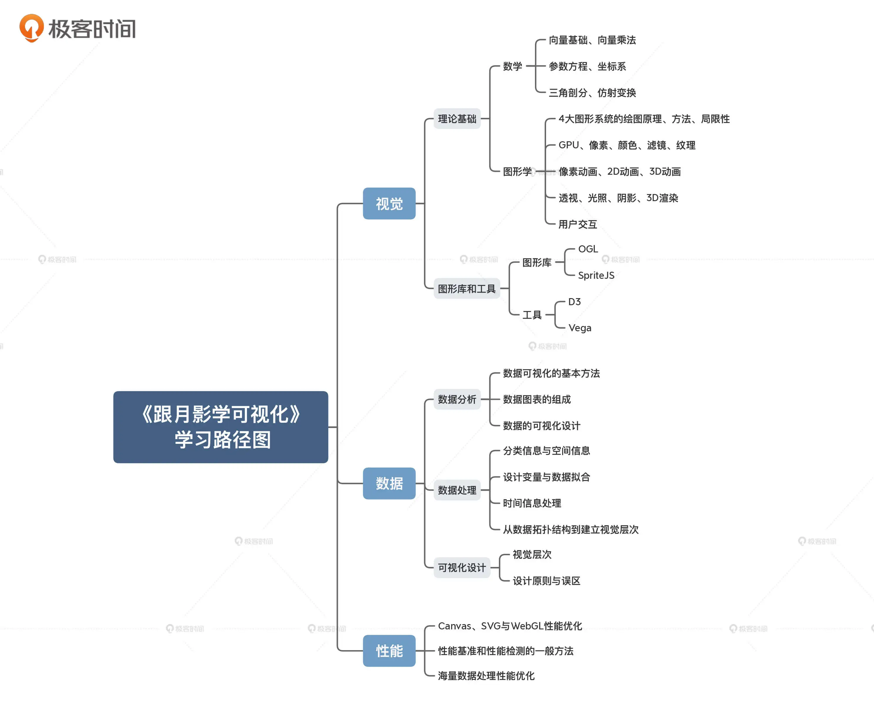 图形基础:带你熟悉 HTML/CSS、SVG、Canvas2D 和 WebGL 这四种图形系统,学会它们的基本用法、优点和局限性,从而能在实际应用中选择合适的图形系统,以达到最好的视觉效果。