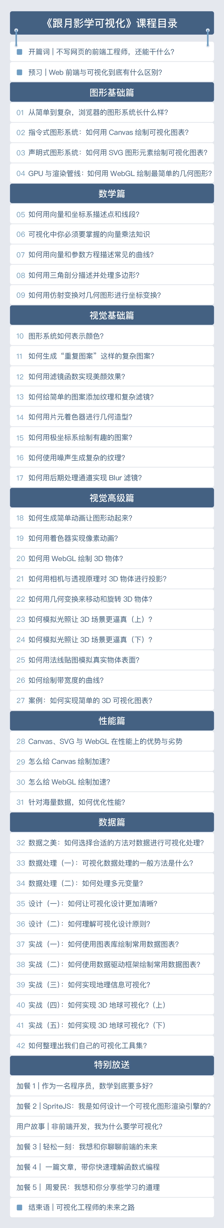 根据可视化的实现方式,课程分为以下五个部分。